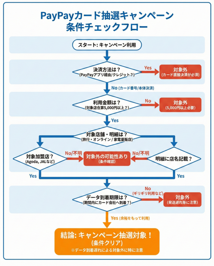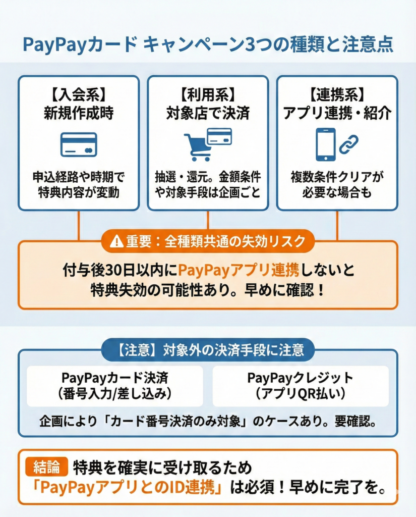 キャンペーンによっては「カード番号を使った決済」のみが対象で、PayPayアプリ経由の支払いは対象外というケースがあります。各企画の対象決済手段は次章の個別解説で整理していますので、参加前にあわせて確認してください。
