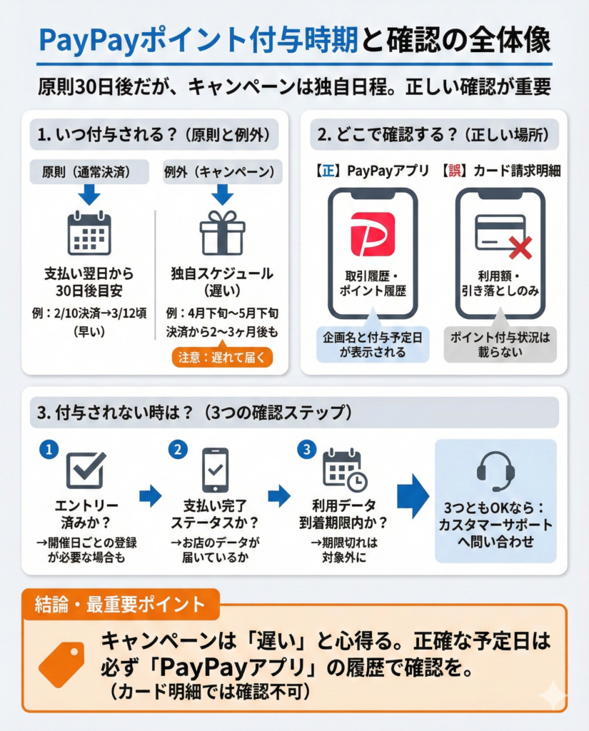 まずエントリー状況、取引履歴の「支払い完了」表示、利用データの到着期限の3点を確認してください。それでも不明な場合はPayPayカードのカスタマーサポートへ問い合わせると対応がスムーズです。